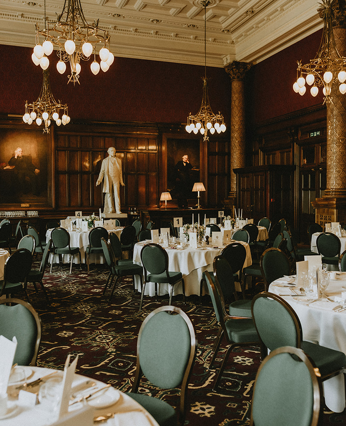 Blessed with a sumptuous view of the river Thames and the London Eye, lined with classic portraits and carefully watched over by impressive statues, the National Liberal Club's Dining Room provides an unforgettable dining experience. The room lends itself perfectly for wedding breakfasts and seated dinners, easily accommodating over 100 guests in a variety of seating layouts.
